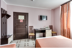 ЖК-телевизор. сплит-система, две односпальные кровати, холодильник, письменный стол, стулья.